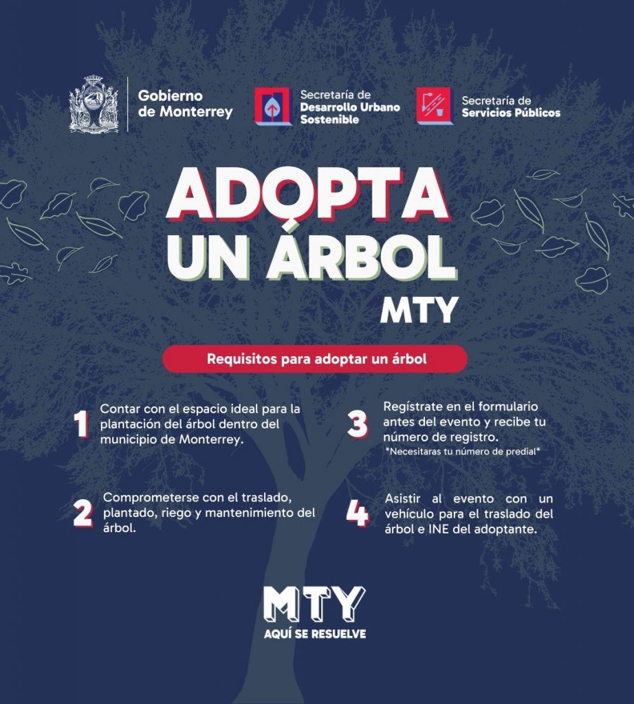 Los requisitos son ser habitantes de esta ciudad, contar con el espacio para la plantación dentro de Monterrey; comprometerse con el traslado, plantado, riego y mantenimiento; registrarse con tiempo (se necesita el número de predial) y asistir a recoger el árbol a donde se le indique portando una identificación con fotografía y domicilio del adoptante (de preferencia la credencial del INE)
