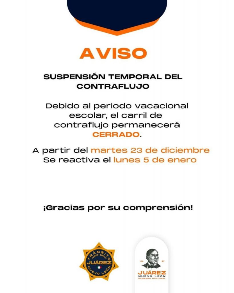Juárez, Nuevo León, a 23 de diciembre de 2025.- Ante la disminución del tránsito vehicular y con motivo del periodo vacacional, el Gobierno Municipal de Juárez, informa a la ciudadanía que el carril de contraflujo que operaba de 6:00 a 8:00 horas sobre la Carretera a Reynosa, en el sentido del Centro de Juárez hacia el municipio de Guadalupe, permanecerá suspendido de manera temporal.
