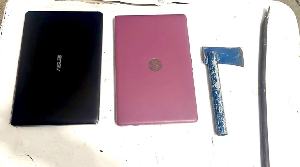 Los oficiales les aseguraron dos laptops y un hacha y una barra metálica, herramientas con las que forzaron el acceso del local para ingresar.