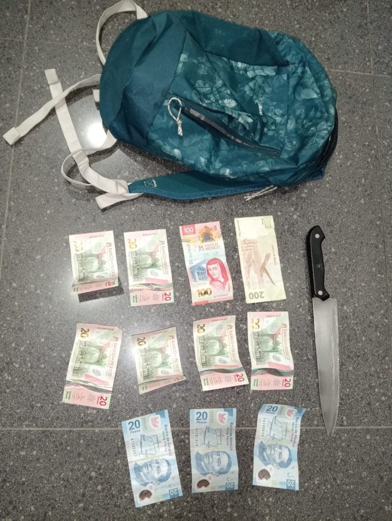 Al realizarle la inspección precautoria, le localizaron en la mochila el dinero que al parecer acababa de robar, además del arma blanca.