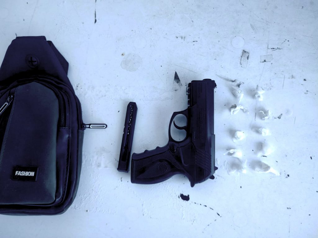 Al revisarlo le localizaron en su poder una mariconera donde ocultaba un arma de postas cargada con balines, además de 10 dosis de una sustancia similar al cristal.
