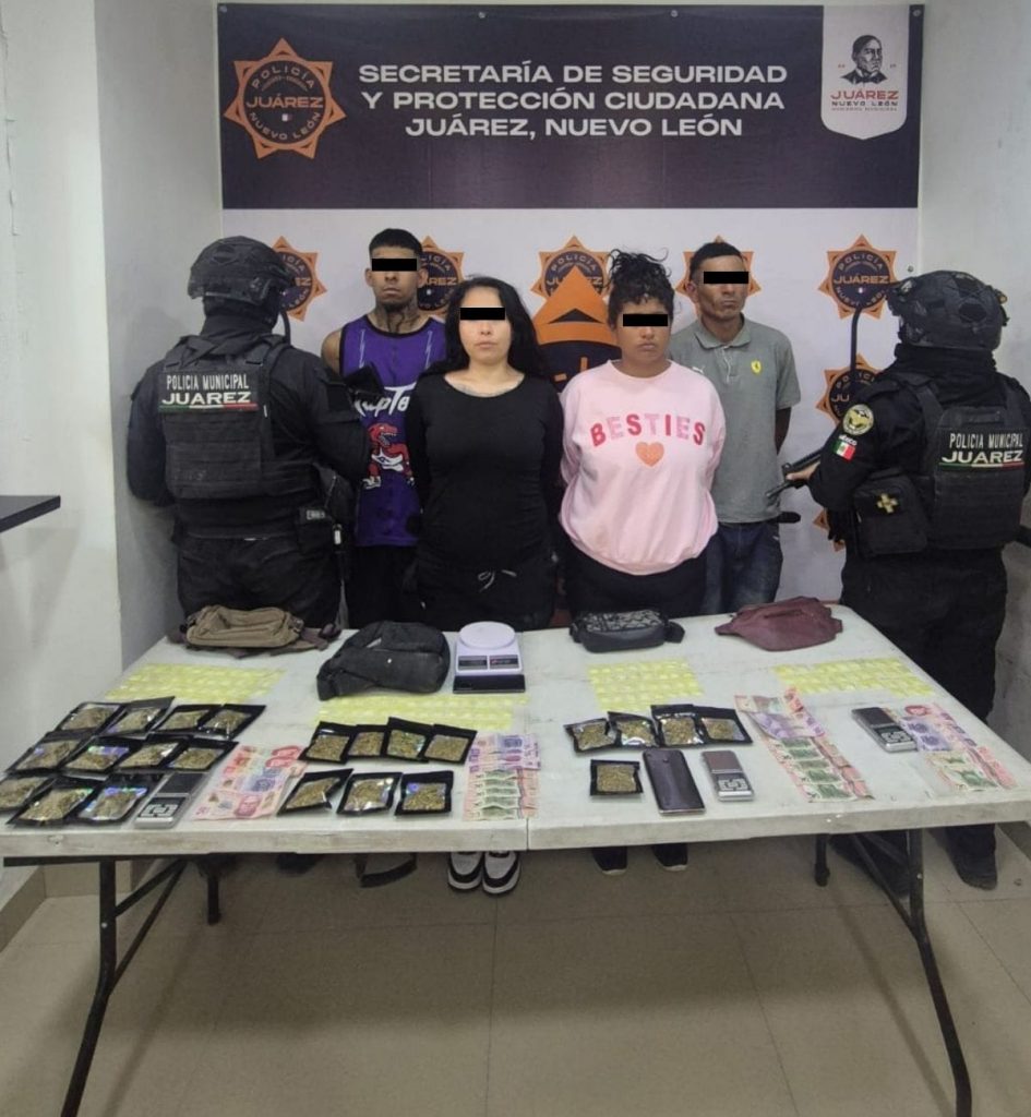 JUÁREZ, N.L.– Como resultado de acciones del Operativo Calles en Orden, elementos de la Secretaría de Seguridad y Protección Ciudadana de Juárez detuvieron a cinco personas por delitos contra la salud en dos intervenciones distintas realizadas en las colonias Mirador del Parque y Las Lomas, donde se aseguraron más de 250 dosis de droga.
