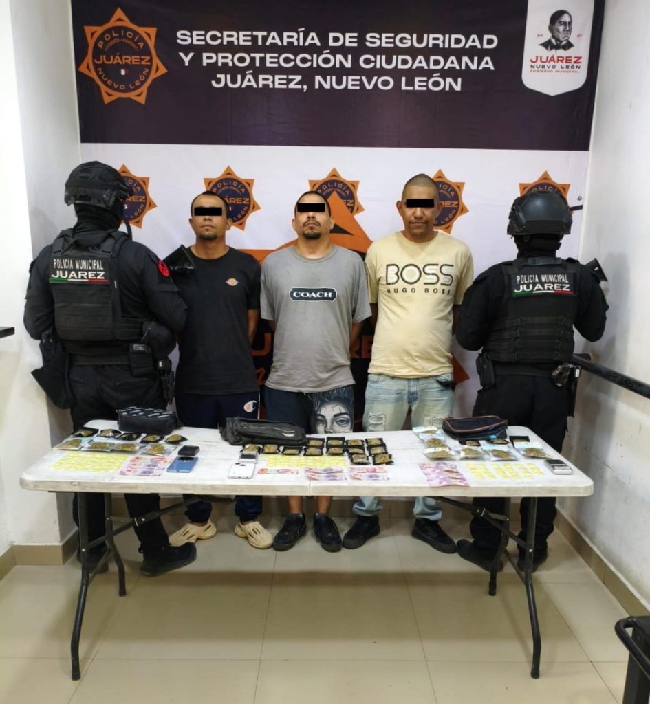 JUÁREZ, N.L.– Tres hombres fueron detenidos por policías de la Secretaría de Seguridad y Protección Ciudadana de Juárez por delitos contra la salud, tras ser sorprendidos intercambiando presuntas drogas en la vía pública, durante acciones del Operativo Calles en Orden en la colonia Mirador de San Antonio, donde se aseguraron 130 dosis de droga.