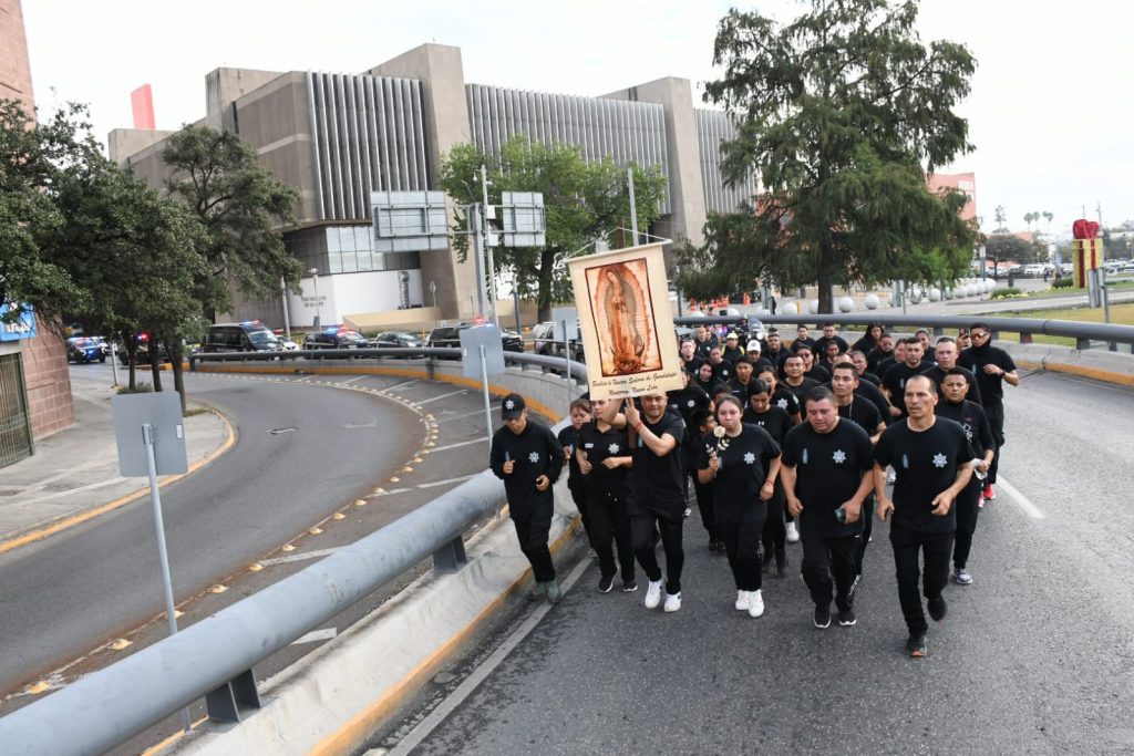 Un grupo de oficiales de la Policía de Monterrey llevan la Rosa de Plata a la Virgen de Guadalupe, al Santuario que se ubica en la Colonia Independencia.