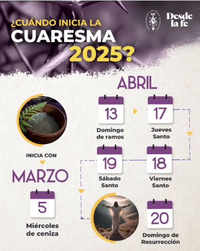 La Cuaresma 2025 inicia el miércoles 5 de marzo con la celebración del Miércoles de Ceniza, que nos prepara cristianamente para vivir la Semana Santa 2025. Aquí te ofrecemos todas las fiestas importantes de la CuaresmaSemana Santa y Tiempo Pascual del 2025.