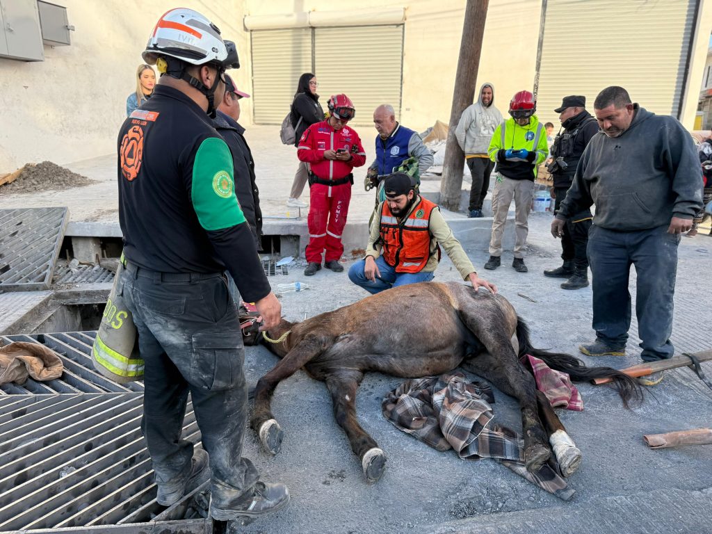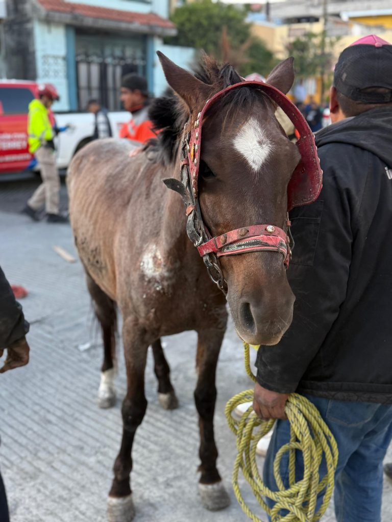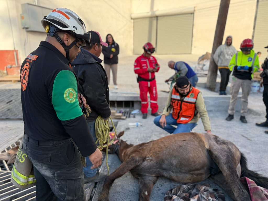 Elementos de Protección Civil del Estado lograron rescatar exitosamente a un caballo de aproximadamente 6 años que permaneció por alrededor de tres horas con una extremidad posterior izquierda atascada en la rejilla de una alcantarilla, en el cruce de las calles Raúl Caballero y Gildardo Magaña, en la colonia Francisco Villa.