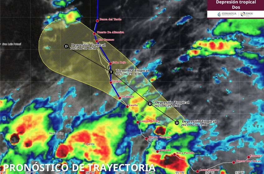 Veracruz, Ver., 29 de junio de 2025.- La Comisión Nacional del Agua (CONAGUA) y la Administración Nacional Oceánica y Atmosférica (NOAA) informaron que la depresión tropical Dos se formó en el Golfo de México, con su centro localizado a 130 km al este-noreste de Veracruz, Veracruz, y a 280 km al este-sureste de Tuxpan, Veracruz.
