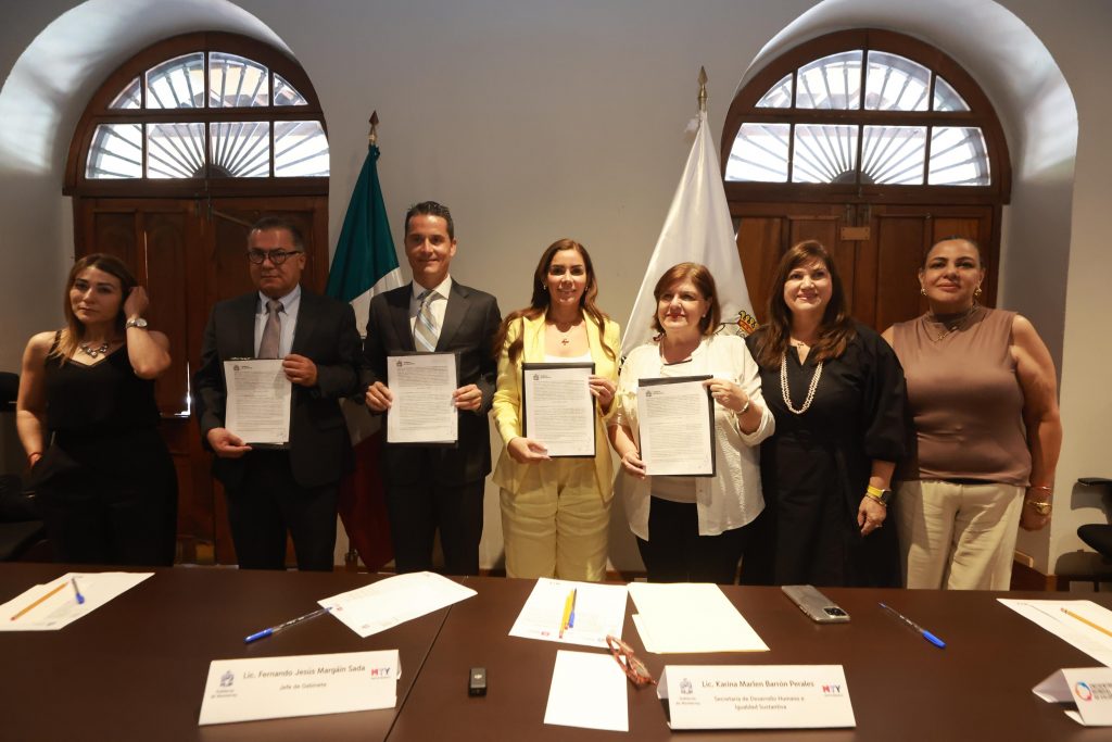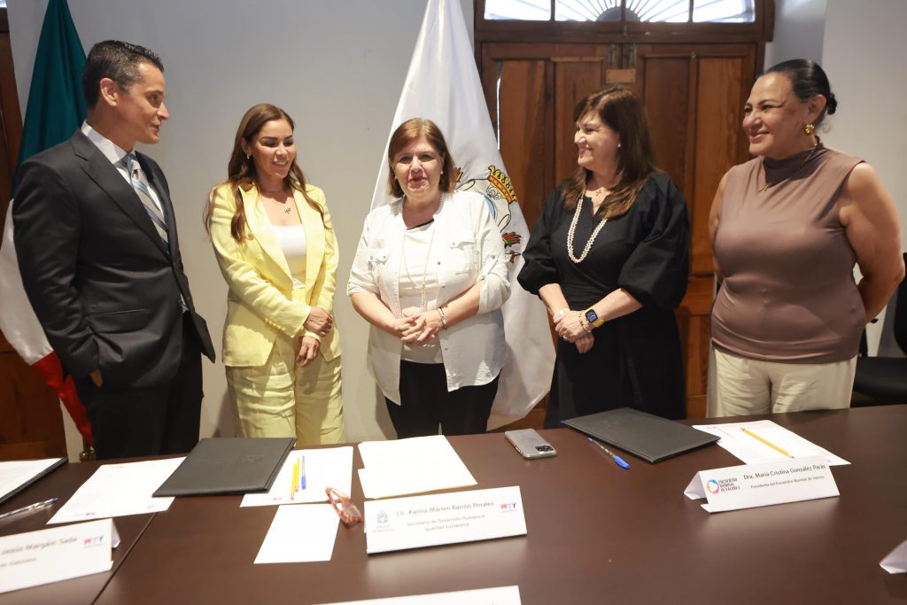 En la firma del contrato participaron Fernando Margáin Sada, jefe de Gabinete municipal; Karina Barrón Perales, secretaria de Desarrollo Humano e Igualdad Sustantiva; Juan Francisco Rodulfo Oropeza, director de Egresos de la Tesorería Municipal y María Cristina González Parás, Presidenta de Encuentro Mundial de Valores A.B.P.