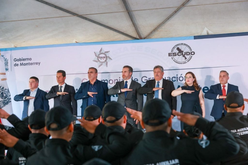 La tarde de este martes se realizó la ceremonia de graduación de la Guardia Auxiliar de Monterrey, con 64 hombres y 40 mujeres, ante la presencia de sus familias, en las instalaciones de la Academia, Formación y Especialización Policial de Monterrey.