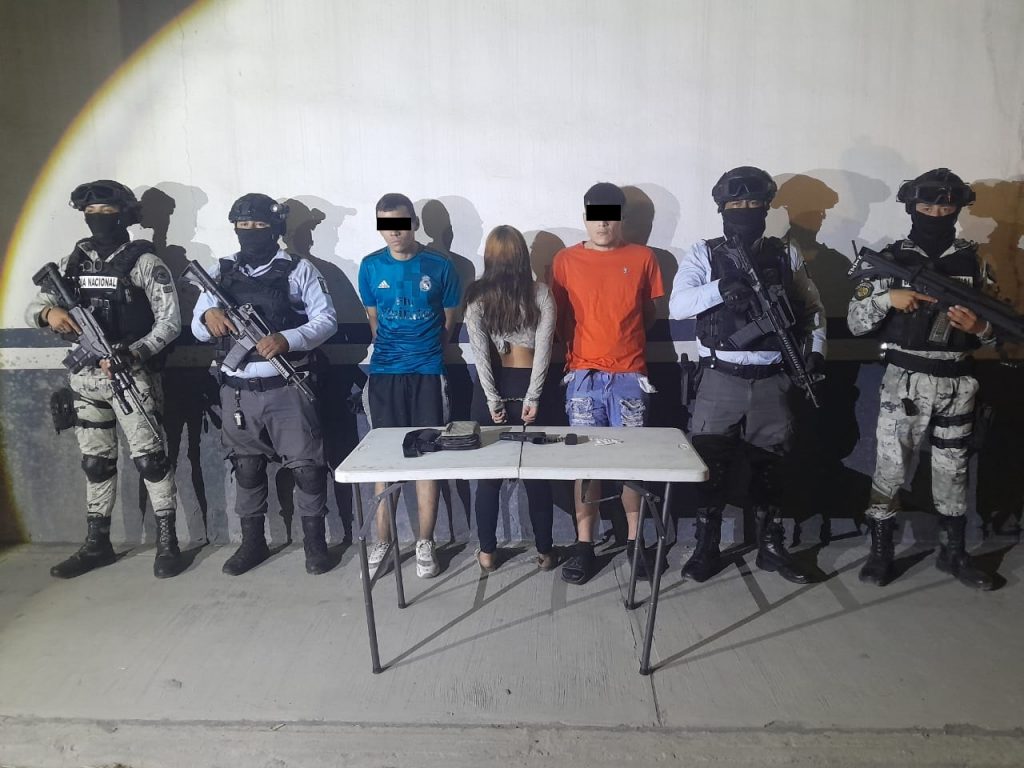 Dos jóvenes y una menor de edad, fueron detenidos por oficiales de la Policía de Monterrey en conjunto con personal de la Guardia Nacional, luego que presuntamente les encontraran en su poder un arma de fuego calibre .45 con seis cartuchos hábiles, además de siete envoltorios con una sustancia similar a la droga cristal, en la colonia Hidalgo.