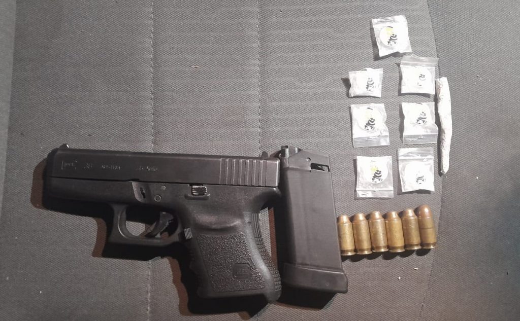 Al inspeccionarlos, le encuentran a Kevin Daniel un arma de fuego calibre .45 con un cargador abastecido con seis cartuchos hábiles, mientras que al otro joven y a la menor les localizan siete bolsitas con una sustancia similar a la droga tipo cristal, por lo que son detenidos.