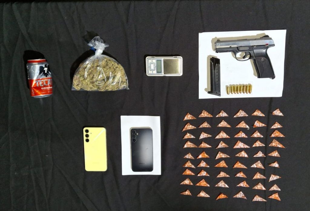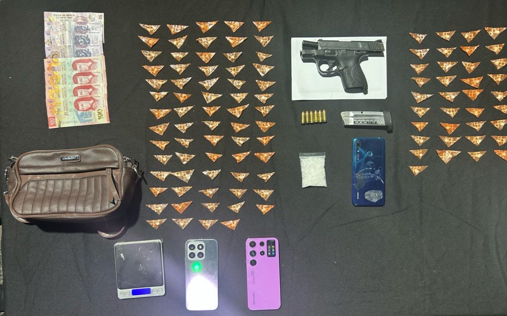 El sujeto se identificó como Aarón N. De 34 años; quien reaccionó agresivamente ante la autoridad, por lo que le solicitaron una revisión a sus pertenencias en la que se encontraron: un arma corta abastecida con ocho cartuchos; 54 envoltorios con una sustancia sólida cristalina, una bolsa con hierba verde y seca con características similares a la marihuana, una báscula, dinero en efectivo y dos celulares.