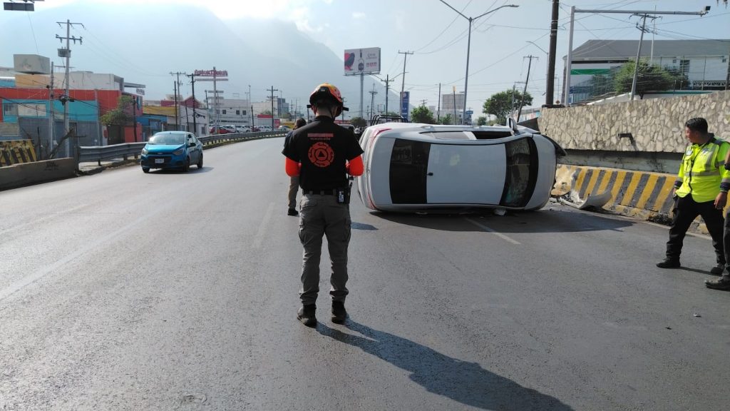 Según reportes de Protección Civil Nuevo León, el conductor de un Hyundai i10 blanco con placas RYK-216-A perdió el control del vehículo, se salió de la curva y se estrelló contra un muro de contención.