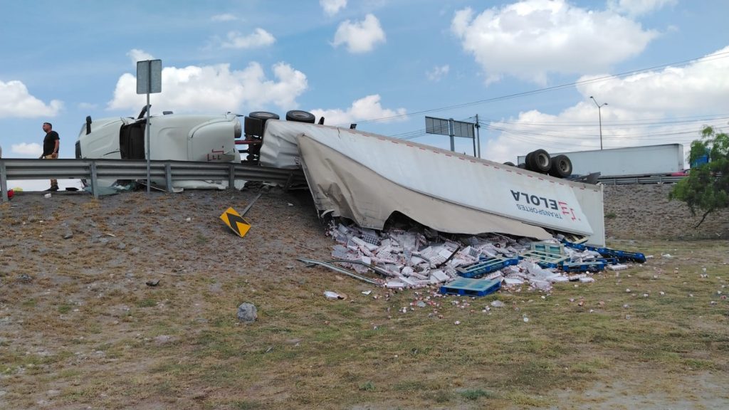 El accidente ocurrió cuando el pesado vehículo perdió el control y terminó de lado, esparciendo gran parte de su carga a un costado de la cinta asfáltica y complicando seriamente la circulación en una de las principales vías de acceso al municipio de Apodaca en vista que el tracto quedó sobre parte del acotamiento